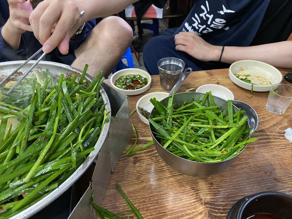 곱창기름이 나오면 그 위에 부추를 올립니다.