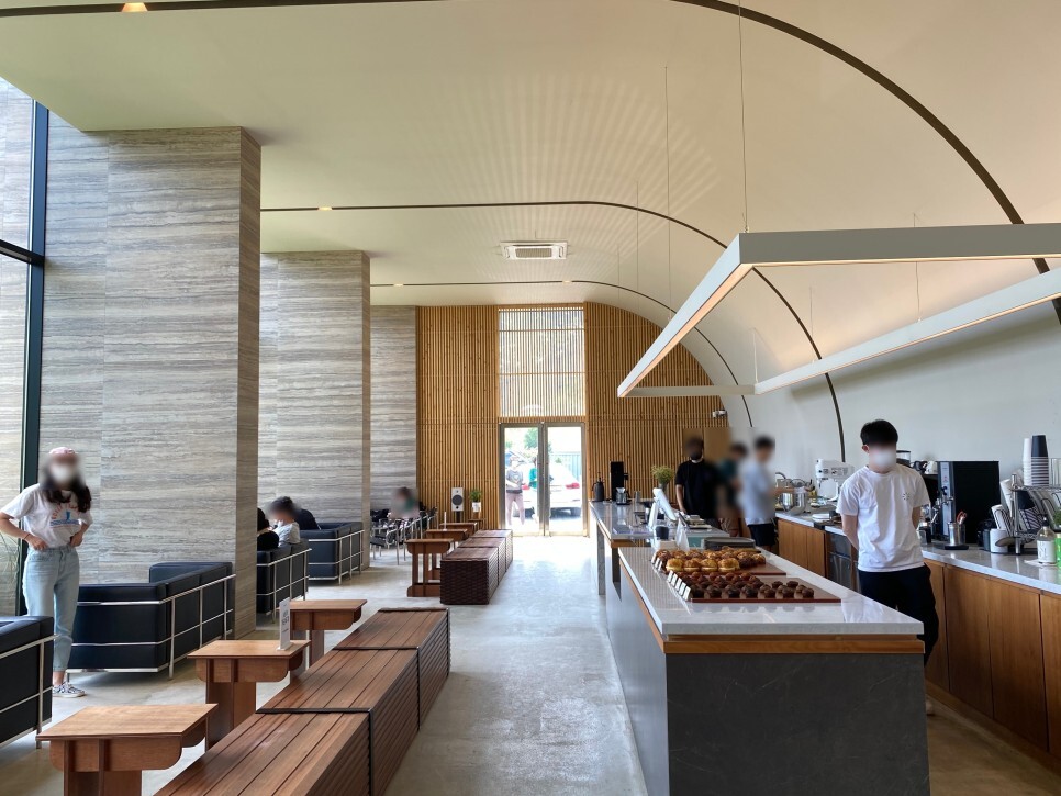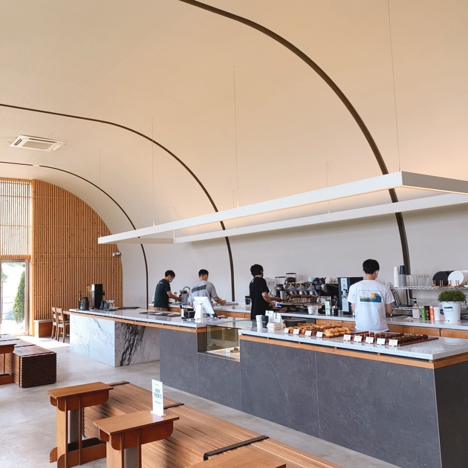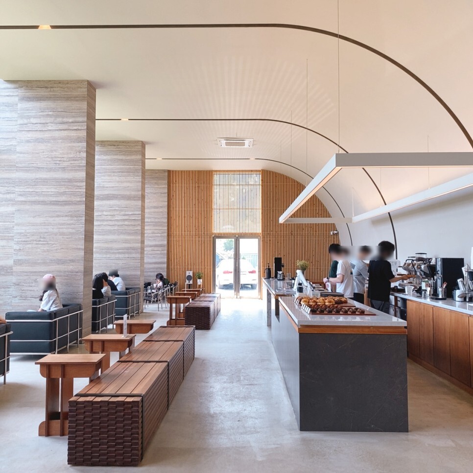 다시 바깥으로 나와 바라본 카페 인테리어는 다시 봐도 예쁩니다. 화이트와 우드, 그리고 석재의 조합은 참 예쁘네요. 거기에 층고가 높고 햇살까지 들어오니 사진이 예쁘게 나올 수밖에 없습니다.