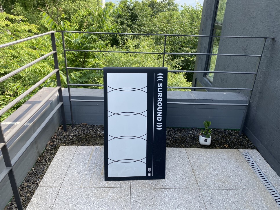 써라운드 입간판이 세워져있는데, 곡선..타원..괄호 를 모티브로 인테리어를 했나 싶습니다.