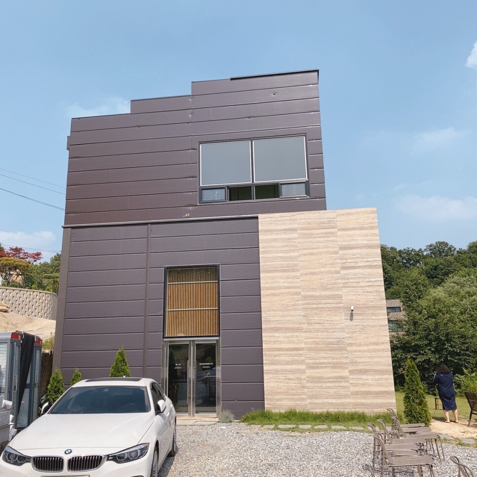 다시 들어오려고 건물쪽을 바라봤는데.... 엄.... 이렇게 익스테리어를 해놨을줄은 몰랐지요. 오른쪽은 내장재로 사용했던 석자재와 동일한 자재를 사용하고, 그 반대편 뒷부분은 칼라강판으로 둘렀네요. 써라운드 카페는 실내에서만 보는것으로... :)