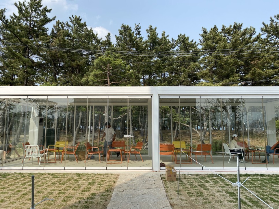 건물을 기준으로 2시방향에 흰색 글라스하우스