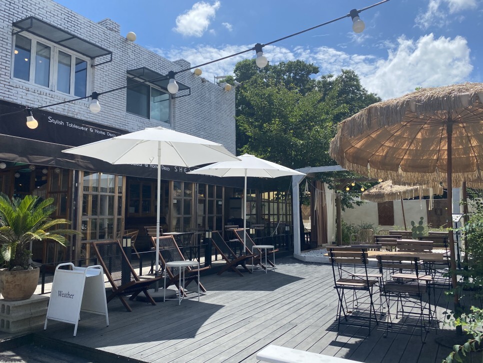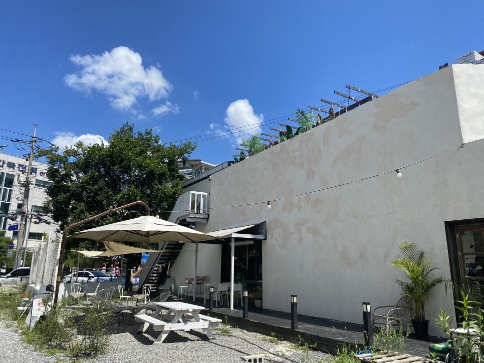 2층에 이렇게 야외 테라스가 따로 마련이 되어 있네요. 근데 오늘 날씨가 너무 더워서 도저히 밖에서 먹을 수가 없어요. 아무리 그늘막이 쳐져 있다 하더라고.. 35도닌까.. 하늘은 참 아름답네요.