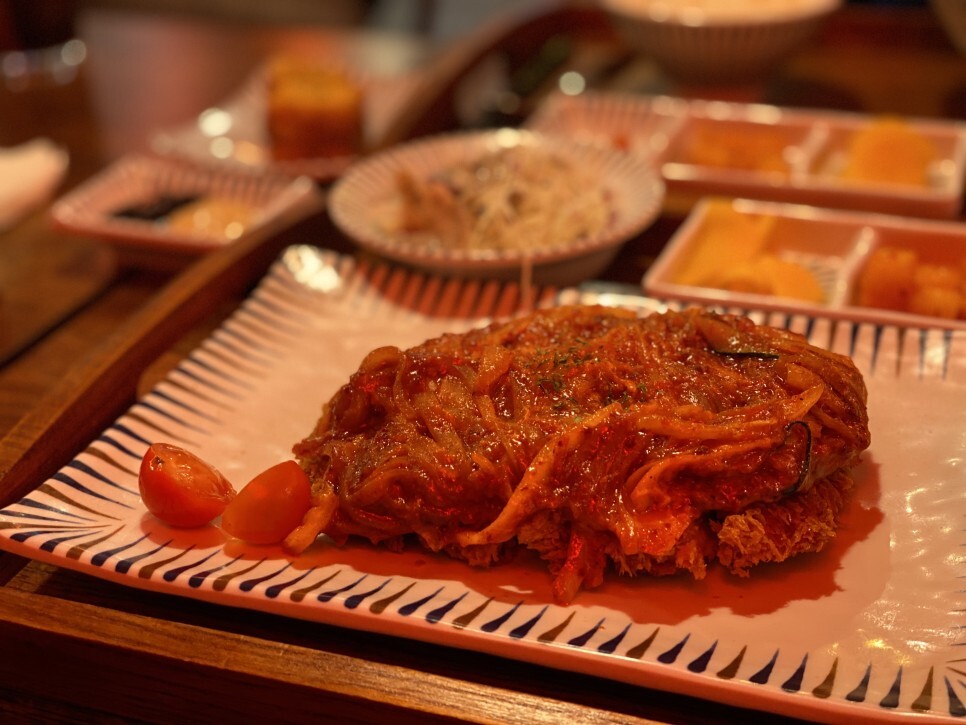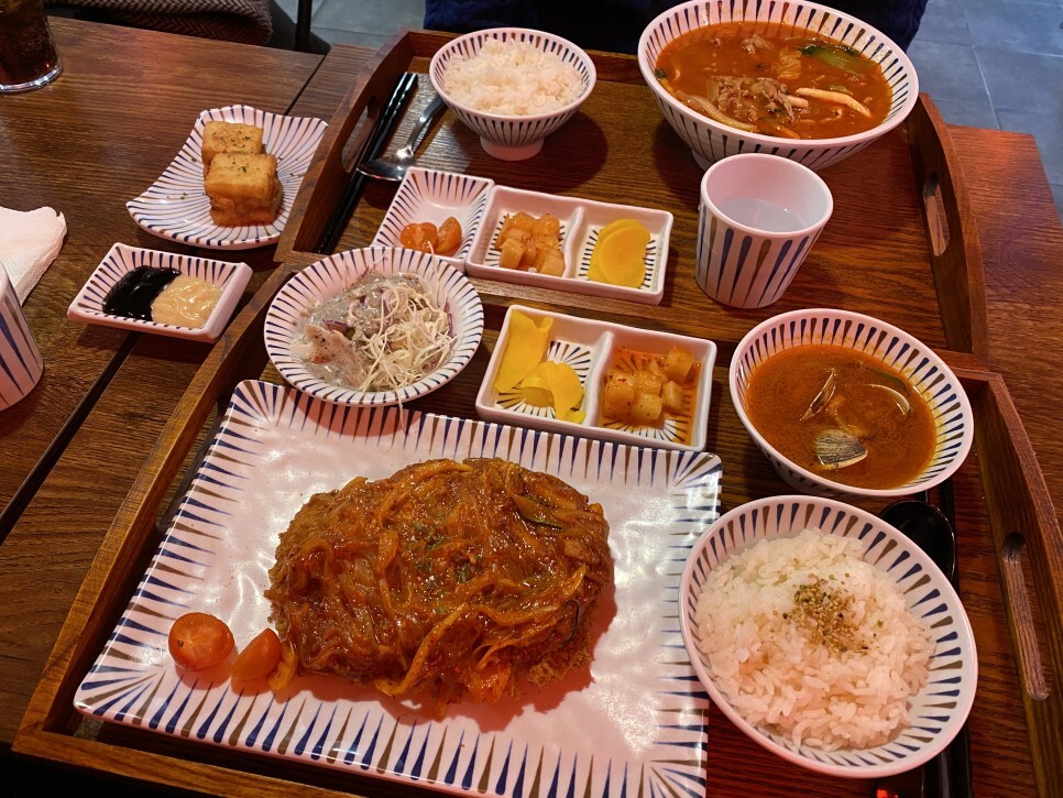 돈카츠에 매운 중화풍의 소스를 얹어서 나왔어요.