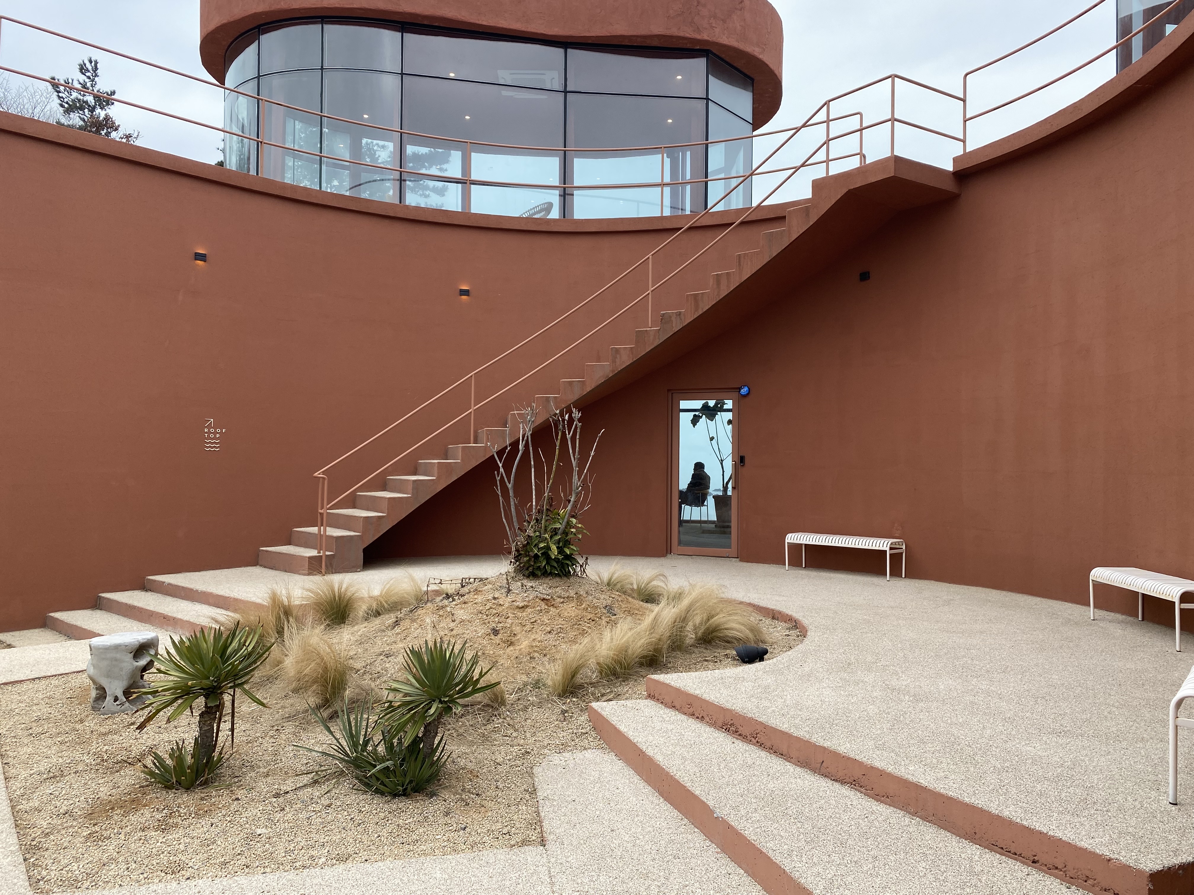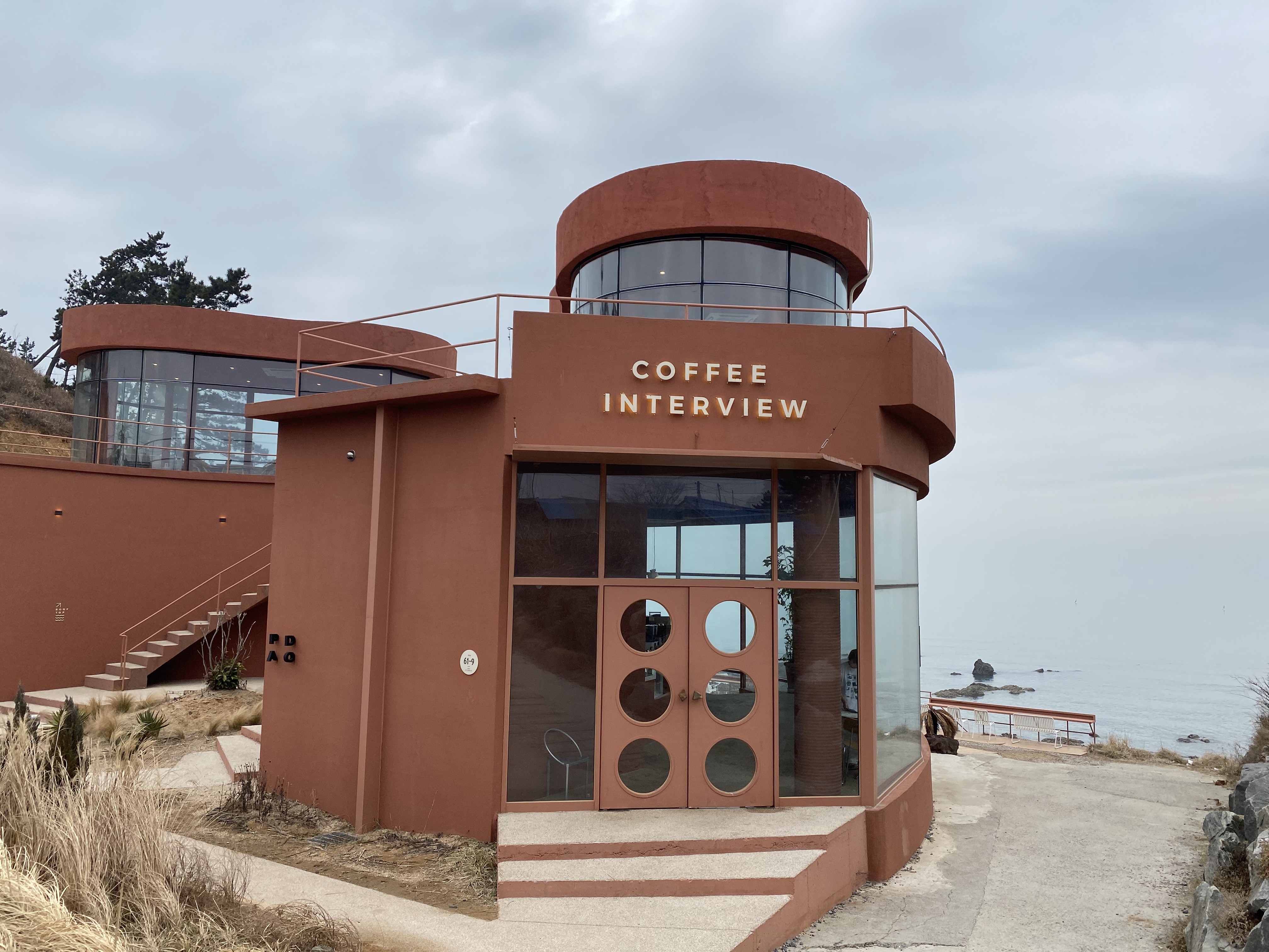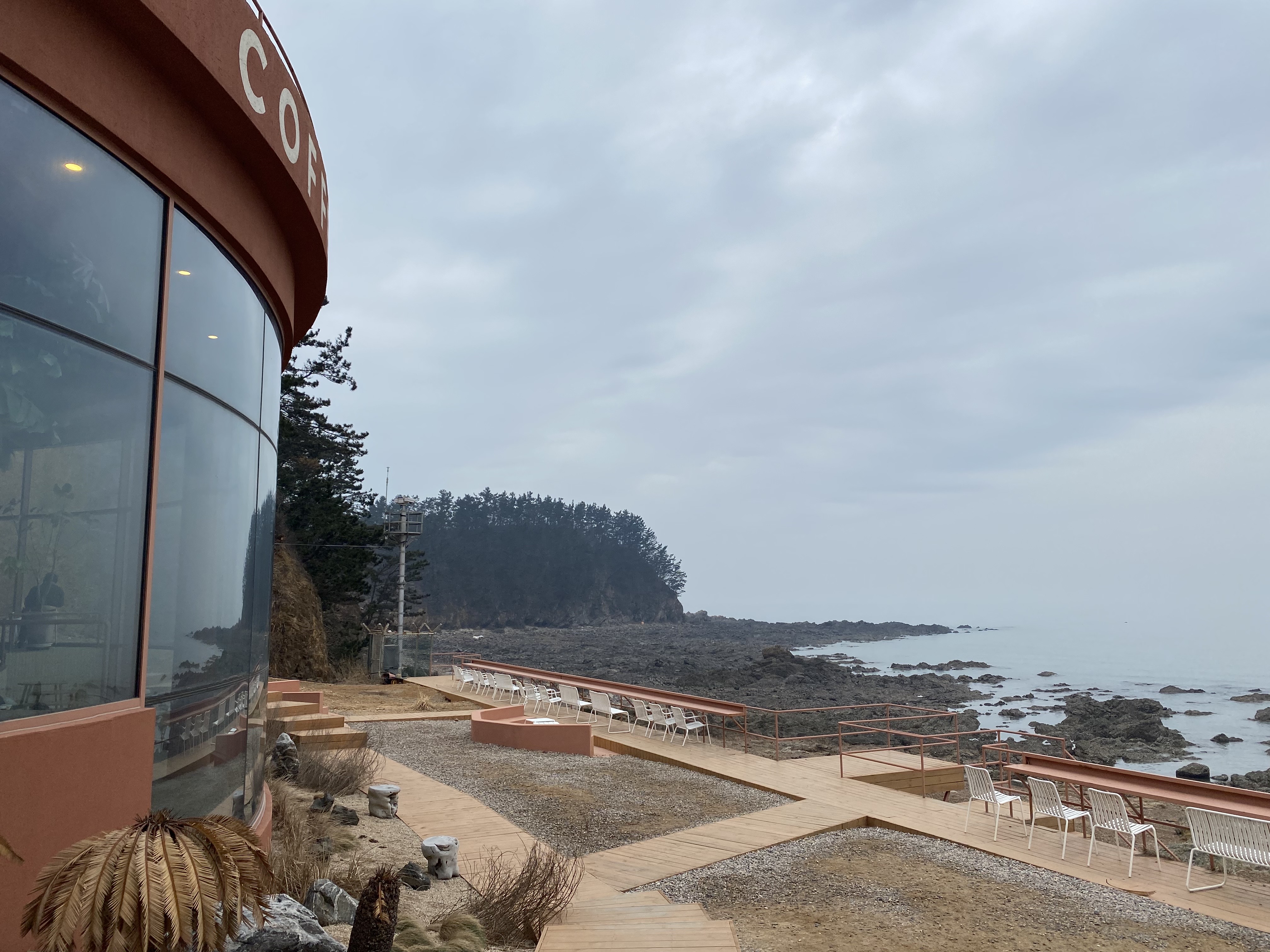 저희가 방문한 날은 원래 비가 오기로 했던 날입니다. 다행히 비가 오진 않았지만 하늘이 그다지 예쁘지 않네요. 그래도 카페는 참 예쁘게 꾸며놨습니다. 뒤로 새파란 바다와 하늘이 펼쳐졌으면 더 아름다웠을텐데 아쉽긴 합니다. 여러분 가실 때는 부디 날씨가 좋아서 저보다 더 아름다운 뷰를 보시길 바랄게요.
