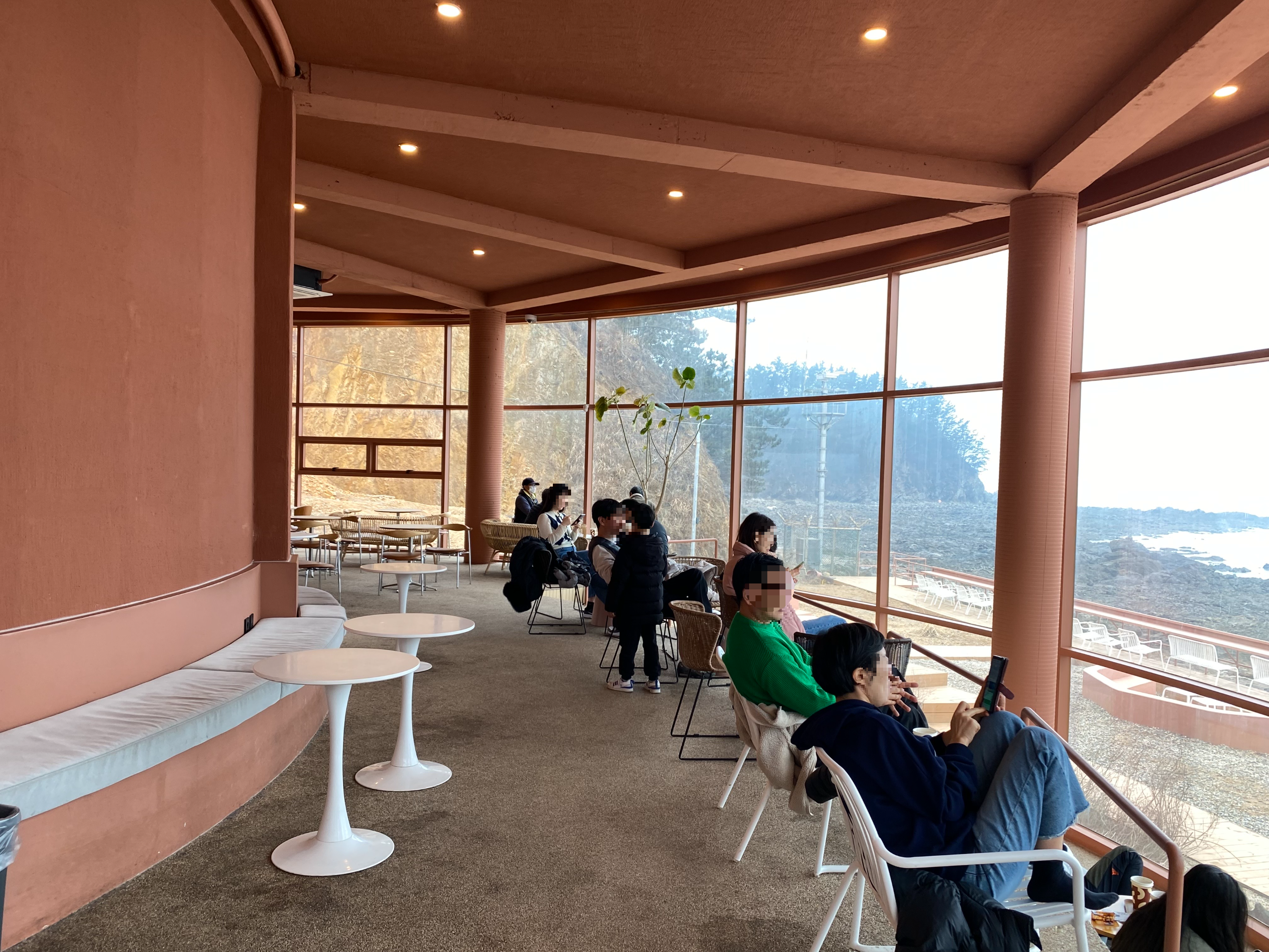 카페 1층 모습입니다. 바다를 바라보고 타원형으로 지어져서 모든 좌석에서 바다를 바라볼 수 있습니다. 자세히 보시면 우측 아래 반지층(?) 이라고 표현해야하나, 계단으로 내려가 앉을 수 있는 좌석이 더 있습니다. 일요일이긴 했는데 날이 추워서 그렇게 붐비진 않았어요.