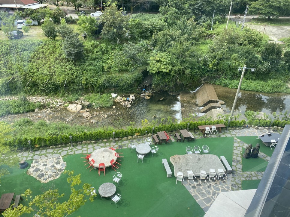 아래를 내려다보니 작은 둑과 계곡이 있네요. 카페에서 연결 되어 있어서 계단을 통해 내려갈 수 있어요. 아이들 노는 모습을 카페에서 지켜볼 수 있겠어요.