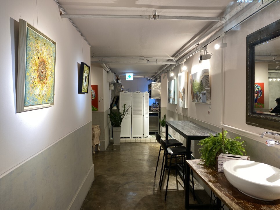 지하실에도 작게 공간이 있고 그림들이 전시되어 있습니다. 이곳은 카페이기도 하면서 전시된 그림을 판매하기도 한다네요. 가격은 보니까 300~ 600만원대로 다양했습니다.