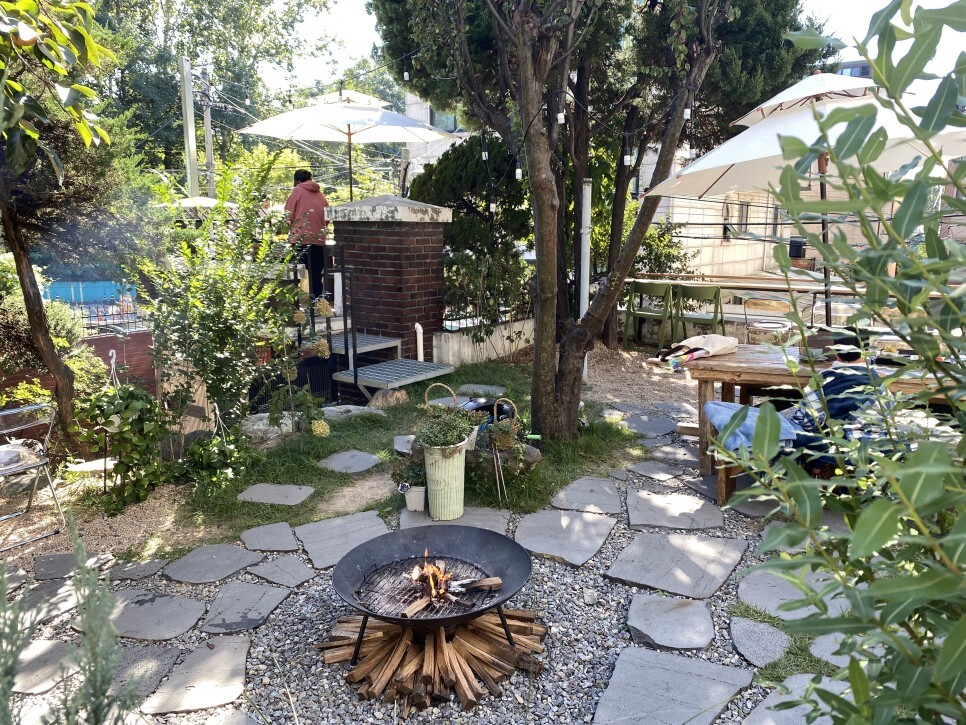 들어가보면 정원이 꾸며져 있고 한쪽엔 화로가 있습니다. 날이 약간 쌀쌀해서 불 가깝게 앉았는데 연기가 너무 많이 날아와서 훈연되는 느낌이었습니다. 가능하면 불은 밖에서만 보고, 커피는 안에서 즐기시길 추천해요.