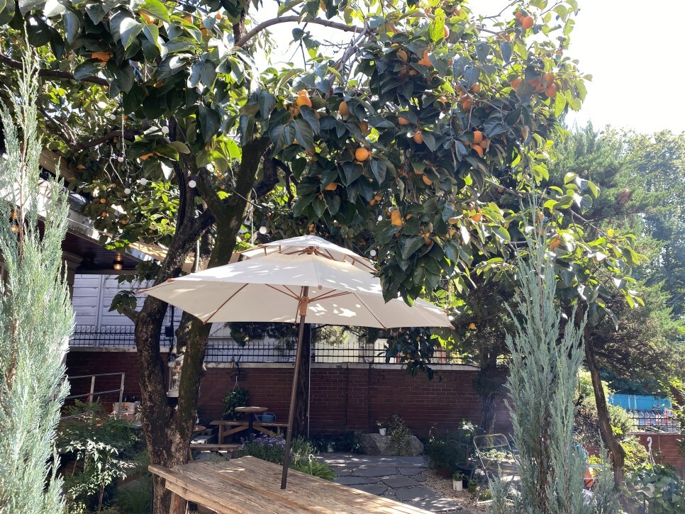 마당엔 커다란 감나무가 있는데 감이 익으면서 아래로 떨어지나 봅니다. 햇빛이 없는데도 파라솔을 설치해 놓은게 아무래도.. 햇빛보단 감을 막기 위한 장치인 것 같아요.