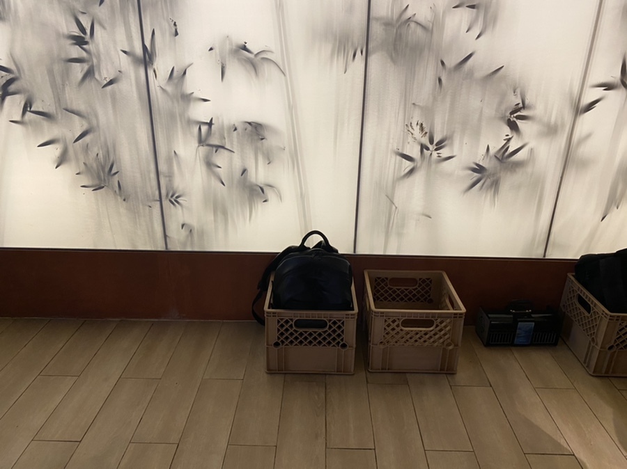일식집 스럽게 가방을 놓는 바구니가 있습니다.