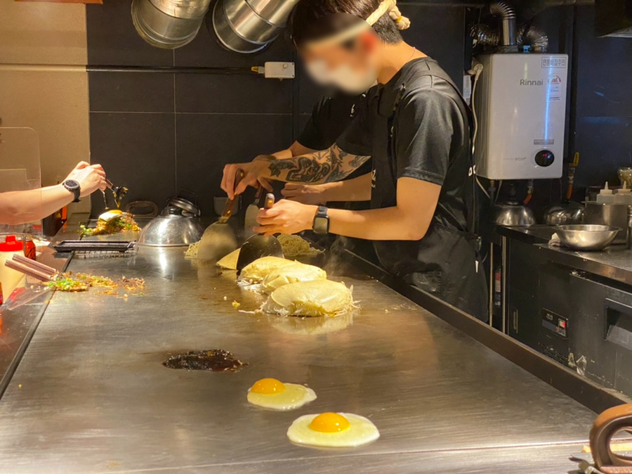 주문이 들거가고 오꼬노미야끼를 만들기 시작해요.