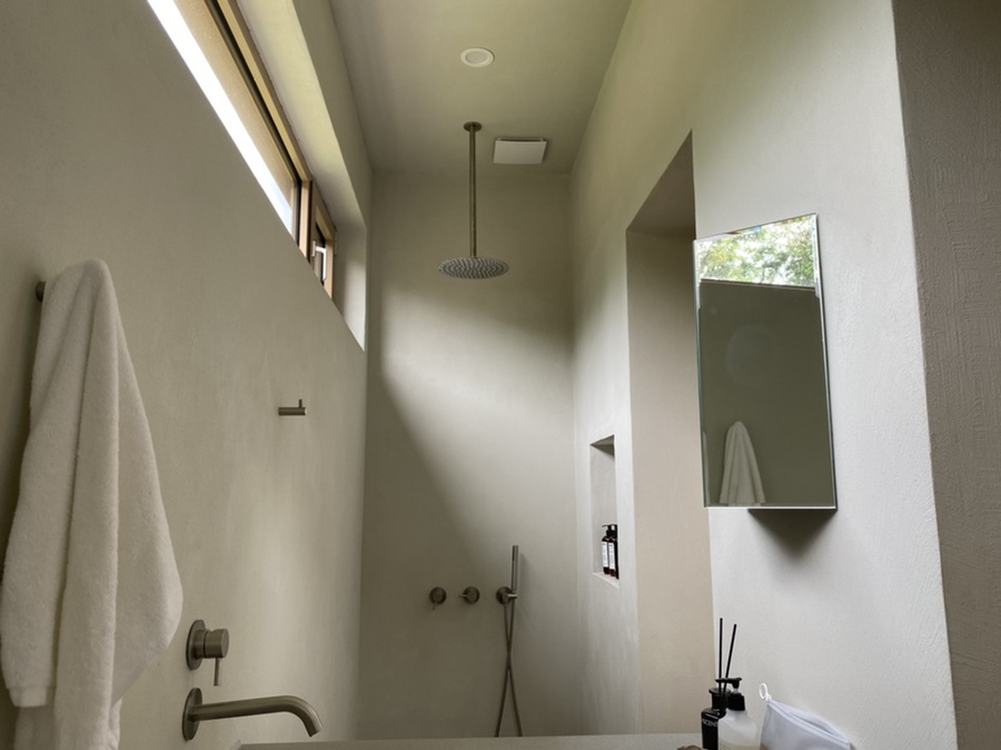 화장실 위에 창을 두어 나무와 하늘이 보입니다.