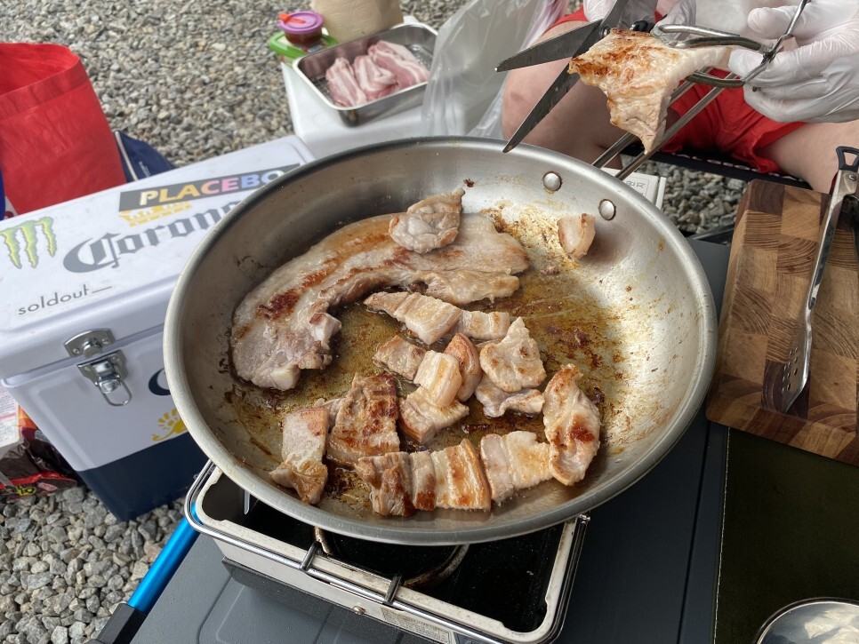 삼겹살을 팬에 노릇노릇하게 구운 다음,