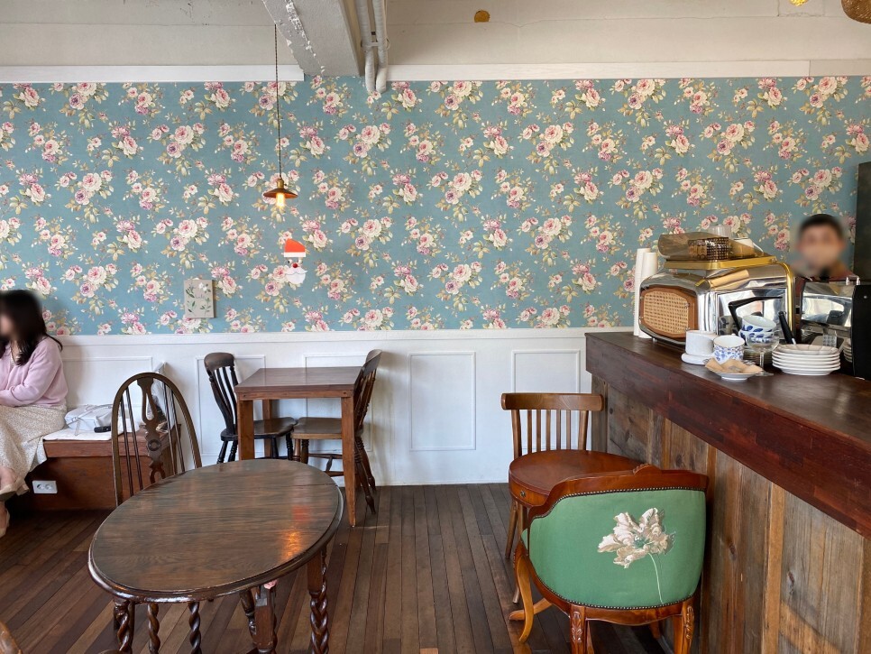 왼쪽에 꽃무니 파랑벽지? 은은한 조명?