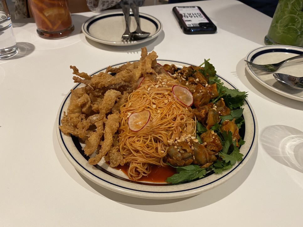 골뱅이파스타와 튀긴 황태가 나옵니다.